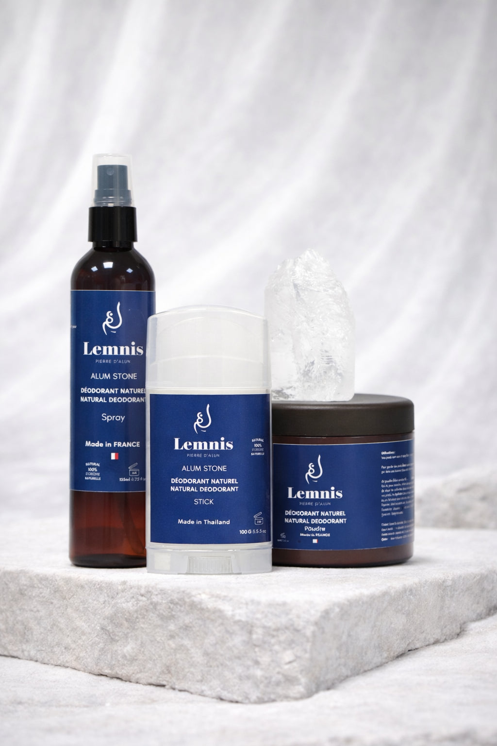 Nos produits, comme le stick et la pierre de 90g, peuvent durer jusqu'à 1 an avec une utilisation quotidienne. Leur longévité en fait une option économique et durable.